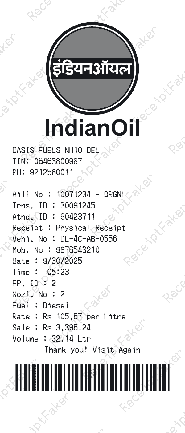 Create clean, printable petrol receipts in seconds. Customize station details, line items, taxes, and payment methods—then download instantly.